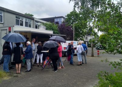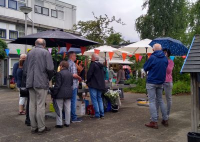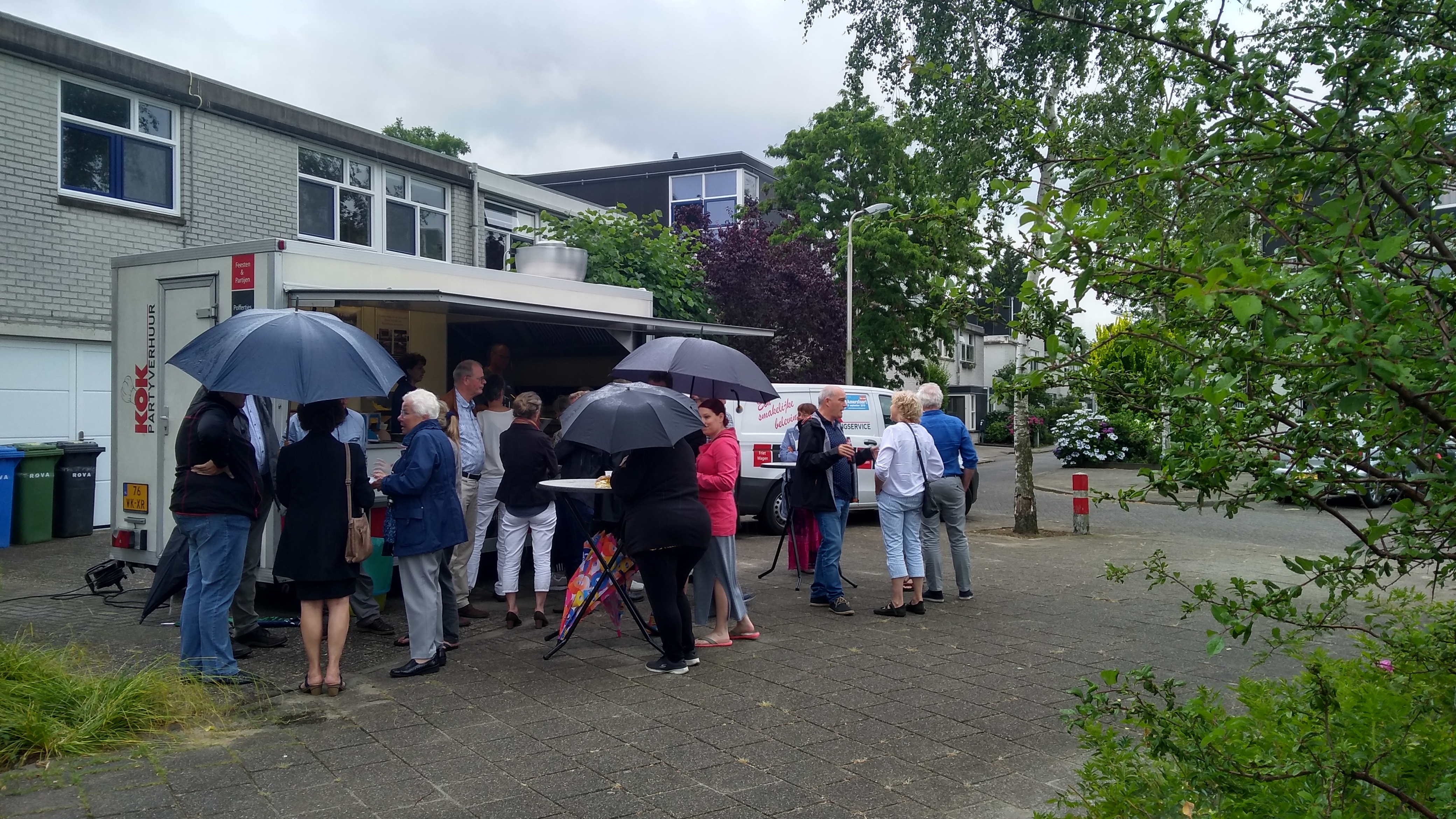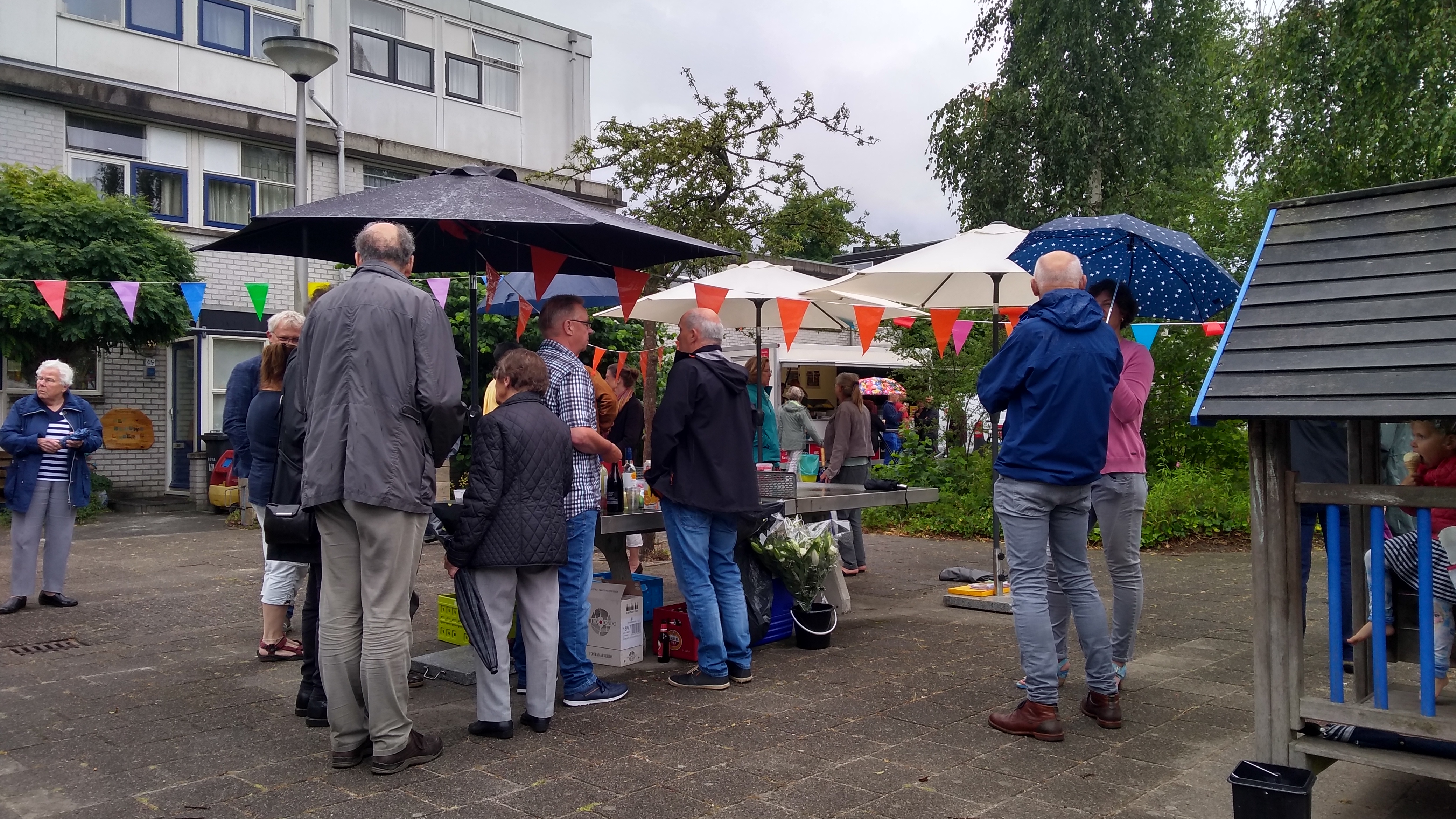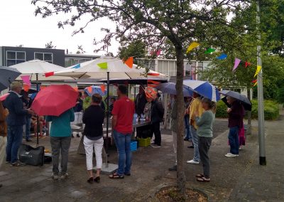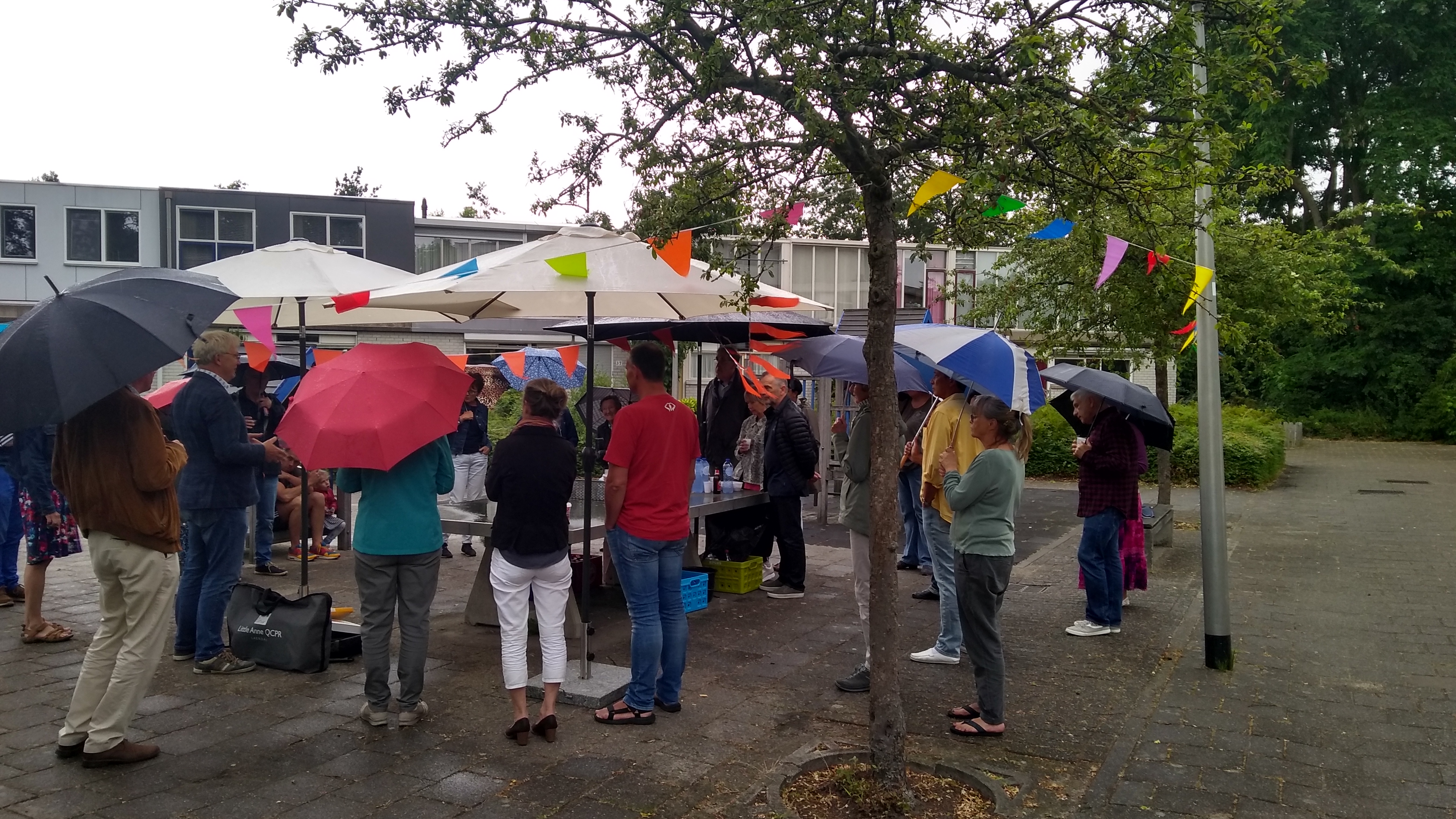Bij het feestje heeft de voorzitter van het reanimatienetwerk Amersfoort voor de buurtbewoners een demonstratie uitgevoerd van de AED. Omdat het onverwacht ging regenen hebben we nog een aantal parasols gehuurd.
