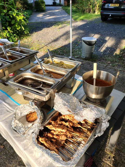 In plaats van bbq-en met veel vlees dat overblijft en gedoe wie wil bakken, hebben we dit jaar gekozen om een Indisch buffet te laten bezorgen. Dit was niet alleen gemakkelijk en afgepast naar het aantal eters, maar ook erg lekker en door iedereen zeer goed ontvangen. Zelf hadden we er alleen nog een komkommer- en fruitsalade bij gemaakt en als afsluiter een ooster-getint toetjesbuffet.