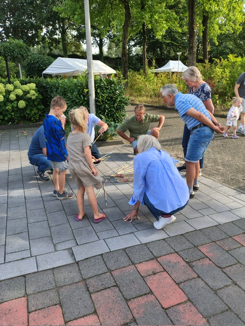 Dit jaar wilden wij het iets anders doen dan voorgaande jaren, waarin de BBQ steeds centraal stond. We begonnen al om 16.00 uur met een gezamenlijke openingscocktail en het startschot voor een echte 5-kamp. In groepjes, jong en oud door elkaar, werden met veel gelach en fanatisme de spellen gespeeld. Eieren doorgeven met eetstokjes, wc-rol uitrollen in zo min mogelijk beurten, woorden in Chinese tekens met schilderstape op straat plakken, mikado-XL en Tangram-X: Ze vonden het allemaal even leuk, al kon er uiteindelijk maar 1 groep Jero-Hero worden!