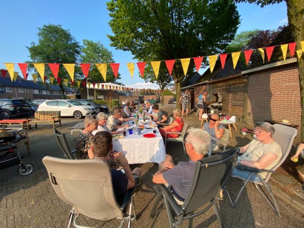 We hebben een lange ‘bertolli’ tafel opgesteld waar alle buurtbewoners aan hebben gezeten/gegeten.